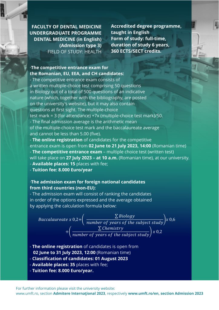 ⇒ THE LIST OF CANDIDATES ROMANIAN NATIONALS (RO), CANDIDATES FROM EUROPEAN UNION (UE), THE EUROPEAN ECONOMIC AREA (EEA), THE SWISS CONFEDARATION (CH) WHOSE FILES HAVE BEEN VALIDATED AND MAY RUN THE ADMISSION EXAM – Dental Medicine in English – (click here)