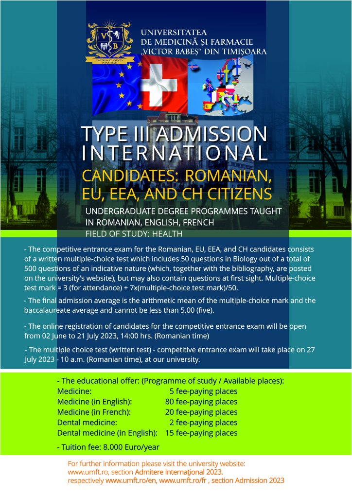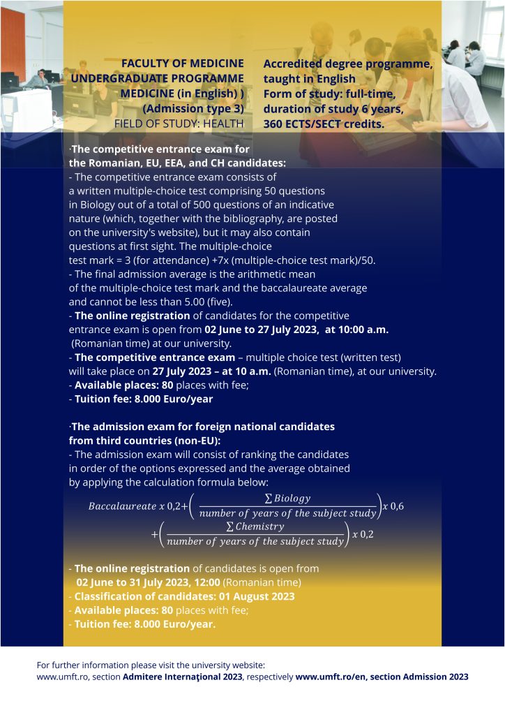 ⇒ THE LIST OF CANDIDATES ROMANIAN NATIONALS (RO), CANDIDATES FROM EUROPEAN UNION (UE), THE EUROPEAN ECONOMIC AREA (EEA), THE SWISS CONFEDARATION (CH) WHOSE FILES HAVE BEEN VALIDATED AND MAY RUN THE ADMISSION EXAM – Medicine in English – (click here)