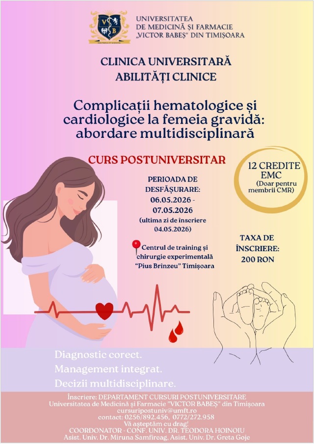 În perioada 06-07 mai 2026, Clinica Universitară Abilități Clinice, Universitatea de Medicină și Farmacie „Victor Babeș” din Timișoara, organizează cursul postuniversitar intitulat „Complicații hematologice și cardiologice la femeia gravidă – abordare multidisciplinară”.