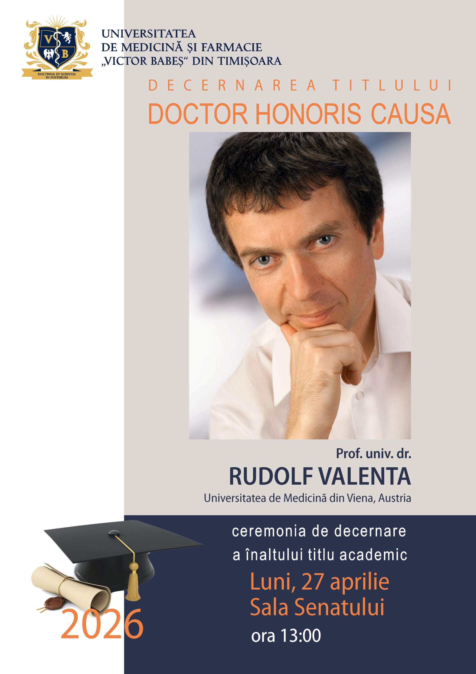 Ceremonia va avea loc în data de 27 aprilie 2026, la ora 13:00, în Sala Senatului a Universității de Medicină și Farmacie „Victor Babeș” din Timișoara.