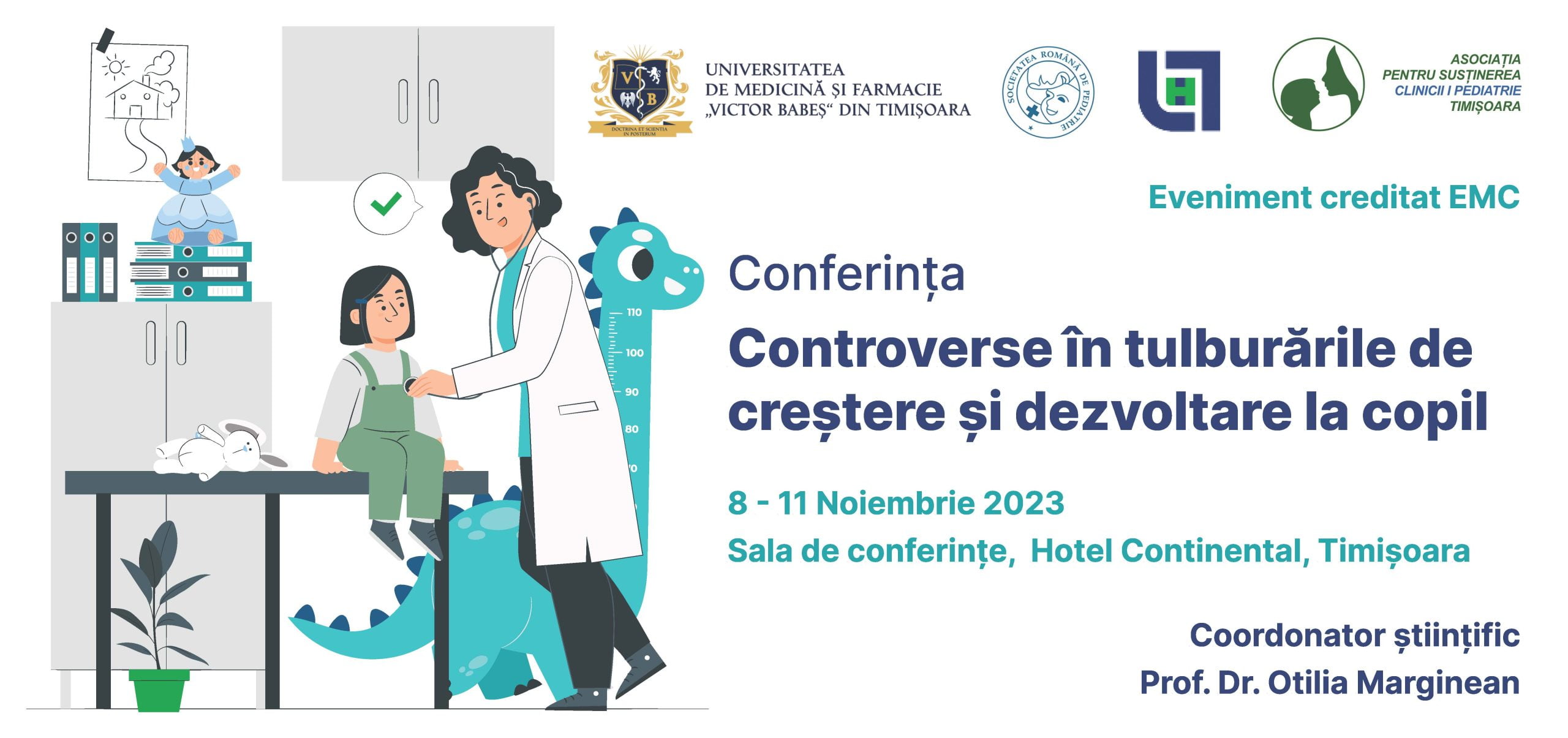 Universitatea de Medicină și Farmacie „Victor Babeș” din Timișoara, Disciplina I Pediatrie, Spitalului Clinic de Urgență pentru copii „Louis Țurcanu” Timișoara, Societatea Română de Pediatrie si Asociația pentru susținerea Clinicii I Pediatrie Timisoara organizează în perioada 8-11 noiembrie 2023 cea de-a 5-a Conferință „Controverse în tulburările de creștere și dezvoltare la copil”.