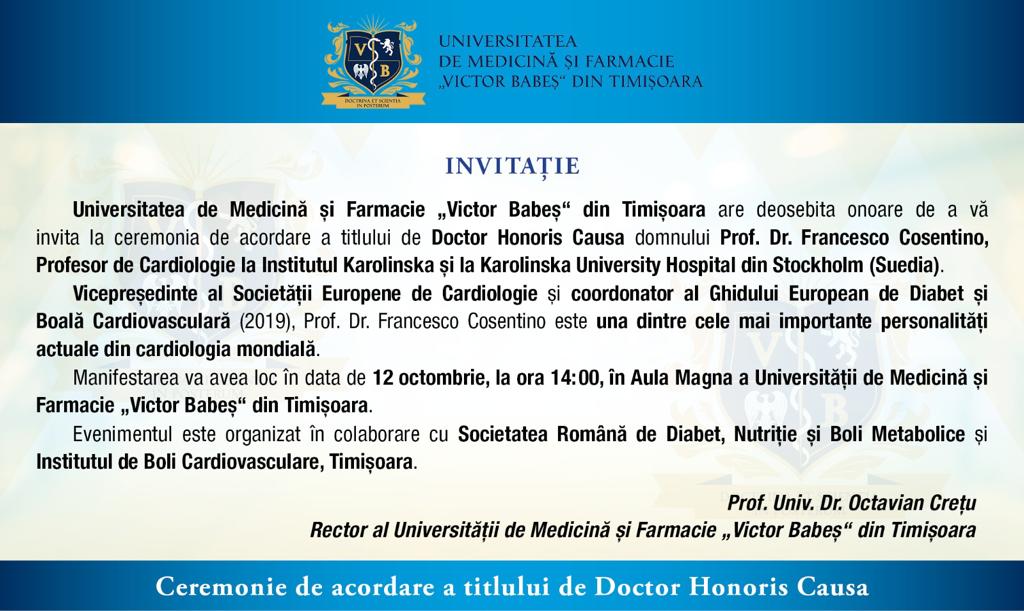 Universitatea de Medicină și Farmacie „Victor Babeș“ din Timișoara are deosebita onoare de a vă invita la ceremonia de acordare a titlului de Doctor Honoris Causa domnului Prof. Dr. Francesco Cosentino, Profesor de Cardiologie la Institutul Karolinska și la Karolinska University Hospital din Stockholm (Suedia).