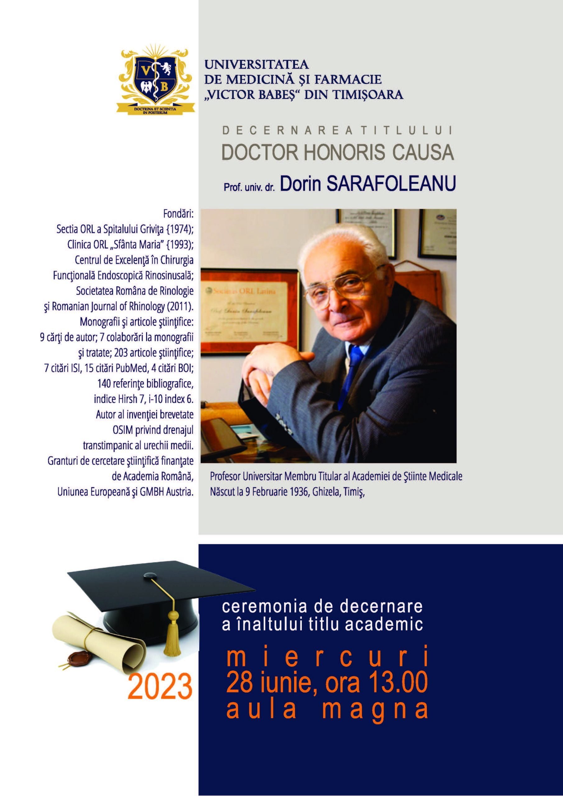 Universitatea de Medicină și Farmacie „Victor Babeș“ din Timișoara are deosebita onoare de a vă invita la Ceremonia de decernare a titlului de Doctor Honoris Causa, domnului Prof. univ. dr. Dorin Sarafoleanu, Membru titular al Academiei de Știinte Medicale din România, Cetăţean de Onoare al Oraşului Timişoara din 2014, Profesor Universitar al Universității de Medicină și Farmacie „Carol Davila” din București.