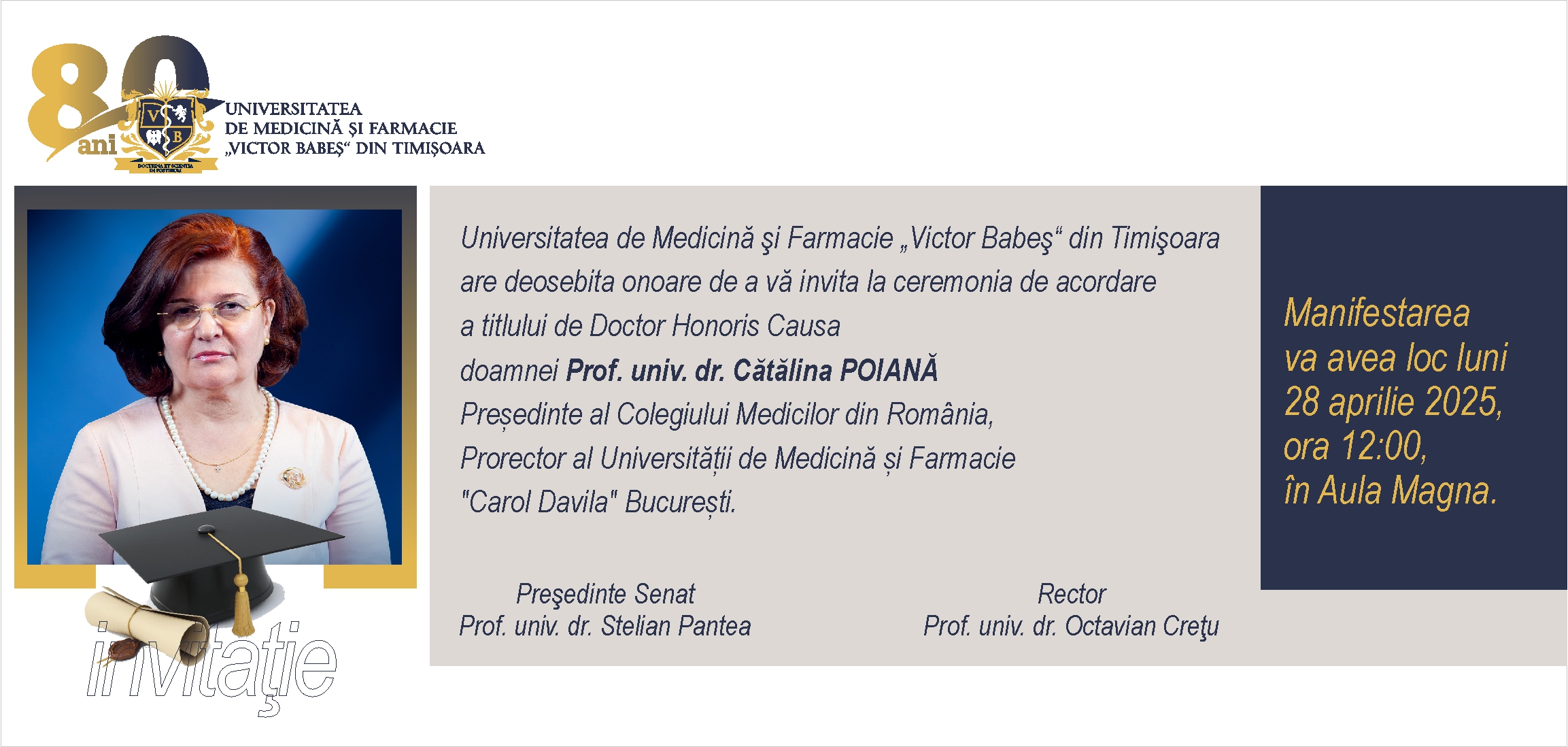 Universitatea de Medicină şi Farmacie „Victor Babeş” din Timişoara are deosebita onoare de a vă invita la ceremonia de acordare a titlului de Doctor Honoris Causa doamnei Prof. univ. dr. Cătălina Poiană, Președinte al Colegiului Medicilor din România, Prorector al Universității de Medicină și Farmacie „Carol Davila” București.