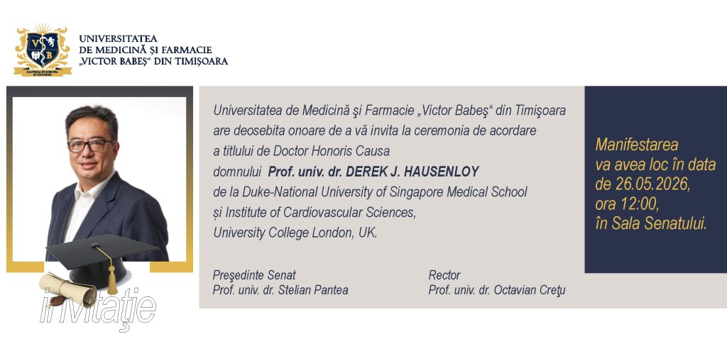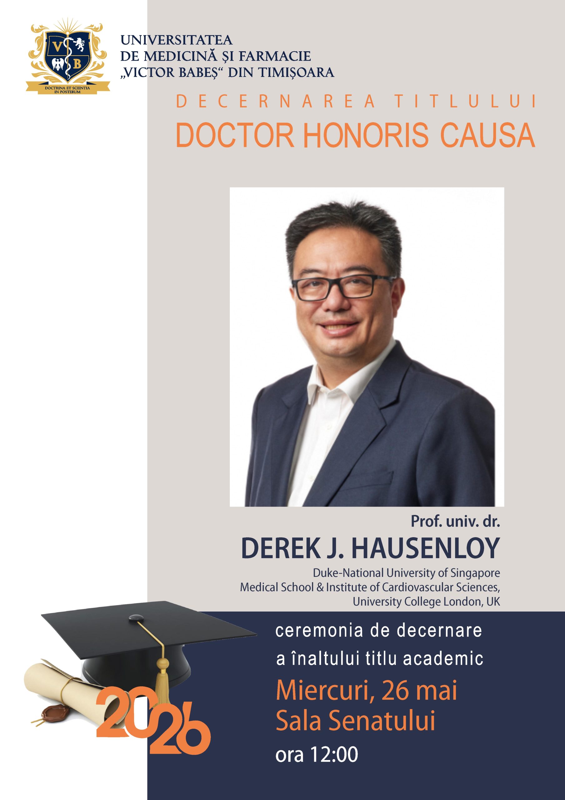 Universitatea de Medicină și Farmacie „Victor Babeș” din Timișoara are deosebita plăcere de a vă invita la Ceremonia de decernare a titlului de Doctor Honoris Causa, Domnului Prof. Univ. Dr. John Derek Hausenloy, profesor în cadrul Diviziei de Boli cardiovasculare și metabolice a Școlii de Medicină, Universitatea Națională Duke din Singapore și Institutul de Științe Cardiovasculare al University College London, Marea Britanie.