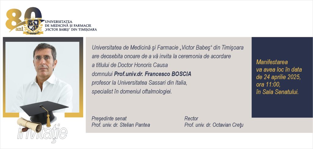 Avem deosebita onoare de a vă invita la Ceremonia de decernare a titlului de Doctor Honoris Causa, domnului Prof. Univ. Dr. Francesco BOSCIA, profesor universitar la Universitatea Sassari din Italia, specialist în domeniul Oftalmologiei.