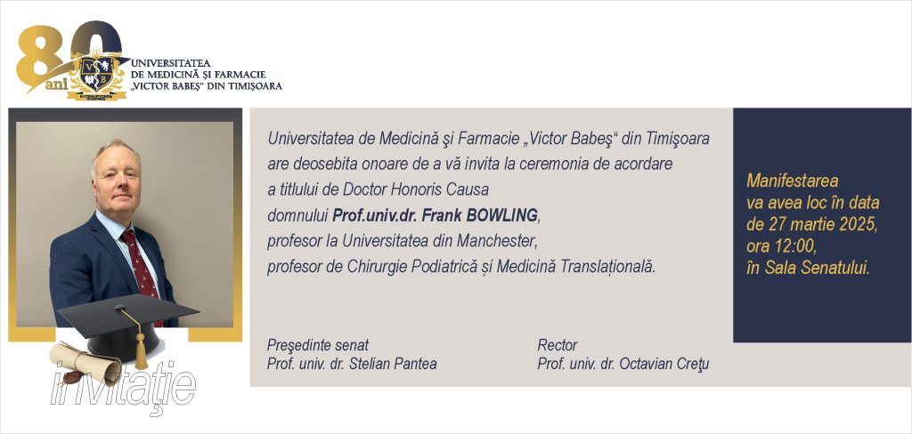 Avem deosebita onoare de a vă invita la Ceremonia de decernare a titlului de Doctor Honoris Causa, domnului Prof. Univ. Dr. Frank Bowling,  profesor universitar si personalitate de talie mondială în Domeniul Chirurgiei Podriatice și a Medicinei Translaționale.