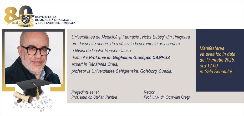 Avem deosebita onoare de a vă invita la Ceremonia de decernare a titlului de Doctor Honoris Causa, domnului Prof. Univ. Dr. GUGLIELMO GIUSEPPE CAMPUS, profesor universitar si personalitate de talie mondială în Domeniul Sănătății Orale.