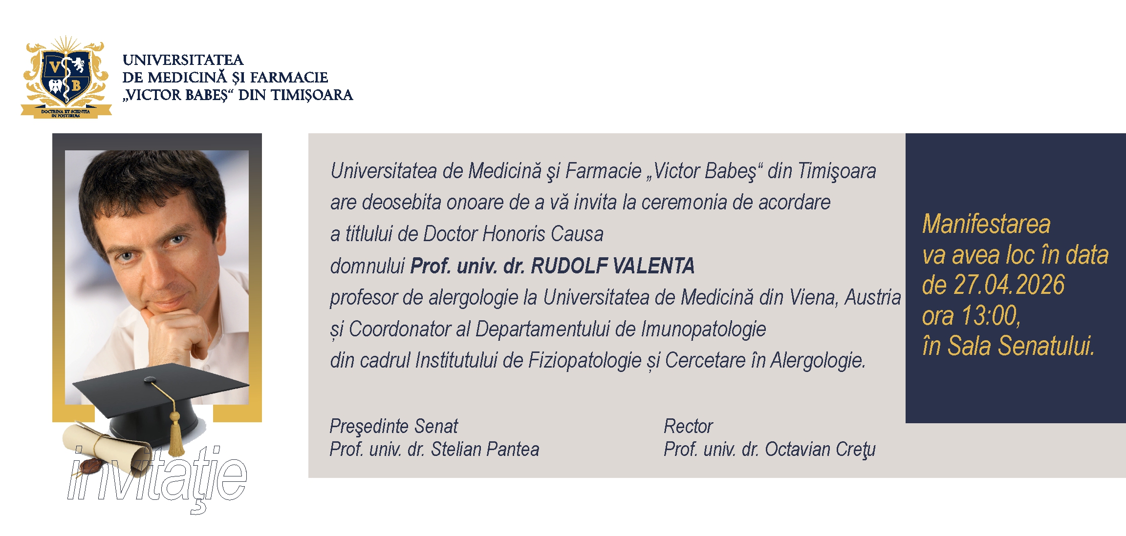 Universitatea de Medicină și Farmacie „Victor Babeș” din Timișoara are deosebita plăcere de vă invita la Ceremonia de decernare a titlului de Doctor Honoris Causa, Domnului Prof. Univ. Dr. Rudolf Valenta, Universitatea de Medicină Viena.