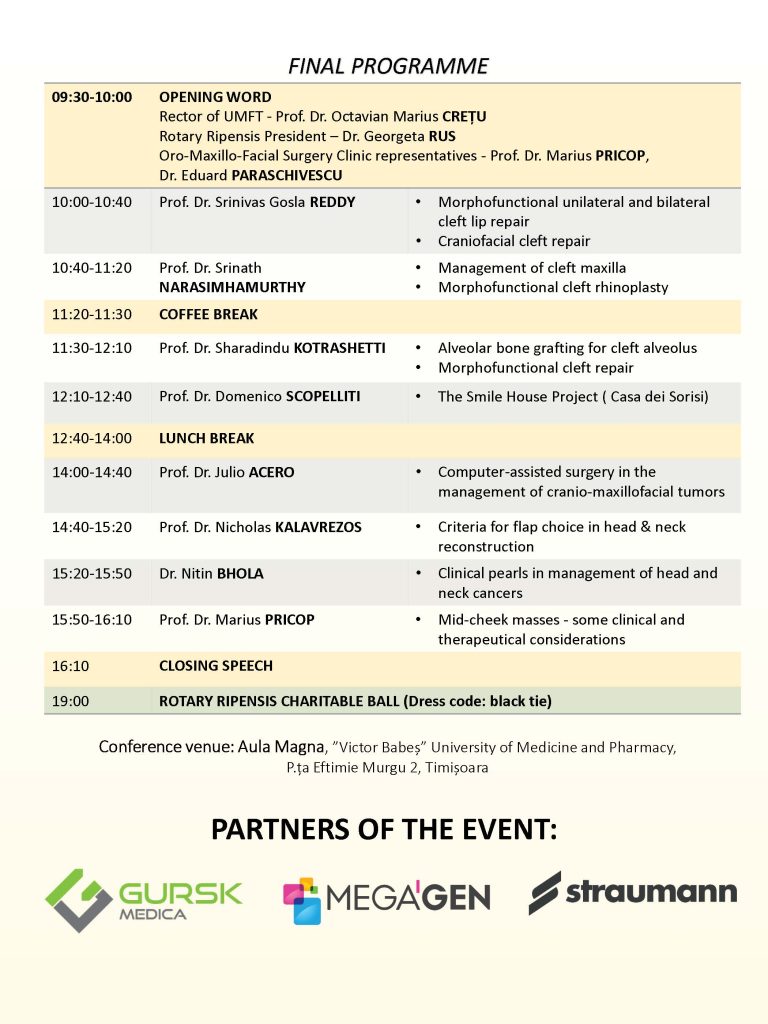 Conferințele vor fi pe teme de malformații faciale (orele 9-13) și oncologie oro-maxilo-facială (orele 14-17,30).