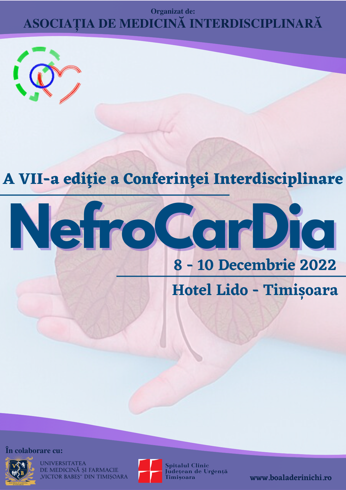 Îmi revine plăcerea de a vă invita la Timişoara, între 8 şi 10 Decembrie 2022, unde va avea loc a VII-a ediţie a Conferinţei Interdisciplinare NefroCarDia, desfăşurată la iniţiativa Asociaţiei de Medicină Interdisciplinară, în colaborare cu Universitatea de Medicină şi Farmacie „Victor Babeş” Timişoara și Spitalul Clinic Județean de Urgență „Pius Brinzeu” Timişoara.