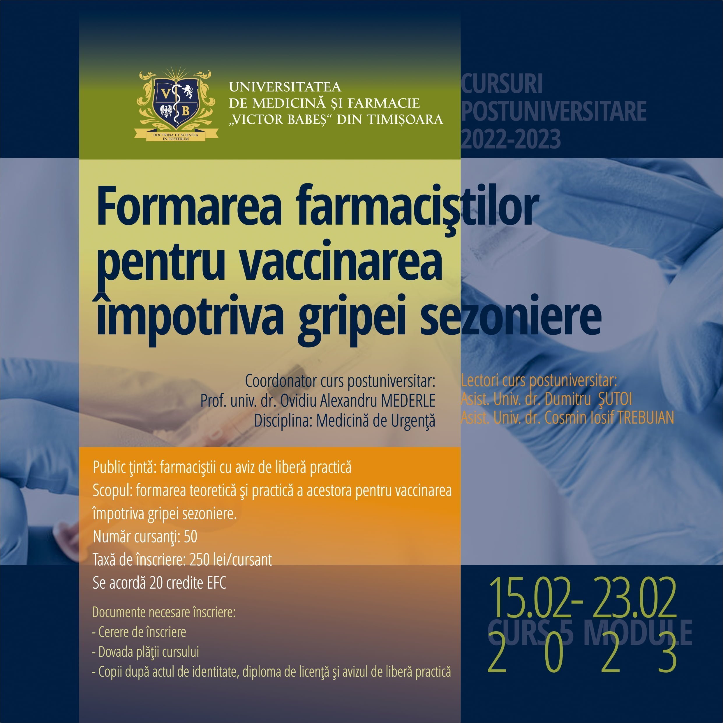În conformitate cu ordonanța 3262/19.10.2022, Universitatea de Medicină și Farmacie „Victor Babeș” din Timișoara cursuri de pregătire postuniversitară destinat farmaciștilor cu aviz de liberă practică în scopul formării teoretice și practice pentru vaccinarea împotriva gripei sezoniere.