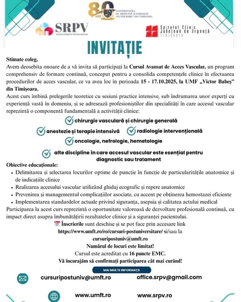 Programul îmbină sesiunile teoretice cu activități hands-on pe manechine și cazuri clinice reale, fiind conceput pentru a dezvolta abilități practice esențiale în gestionarea pacienților care necesită acces vascular pentru dializă, tratamente oncologice sau proceduri critice.