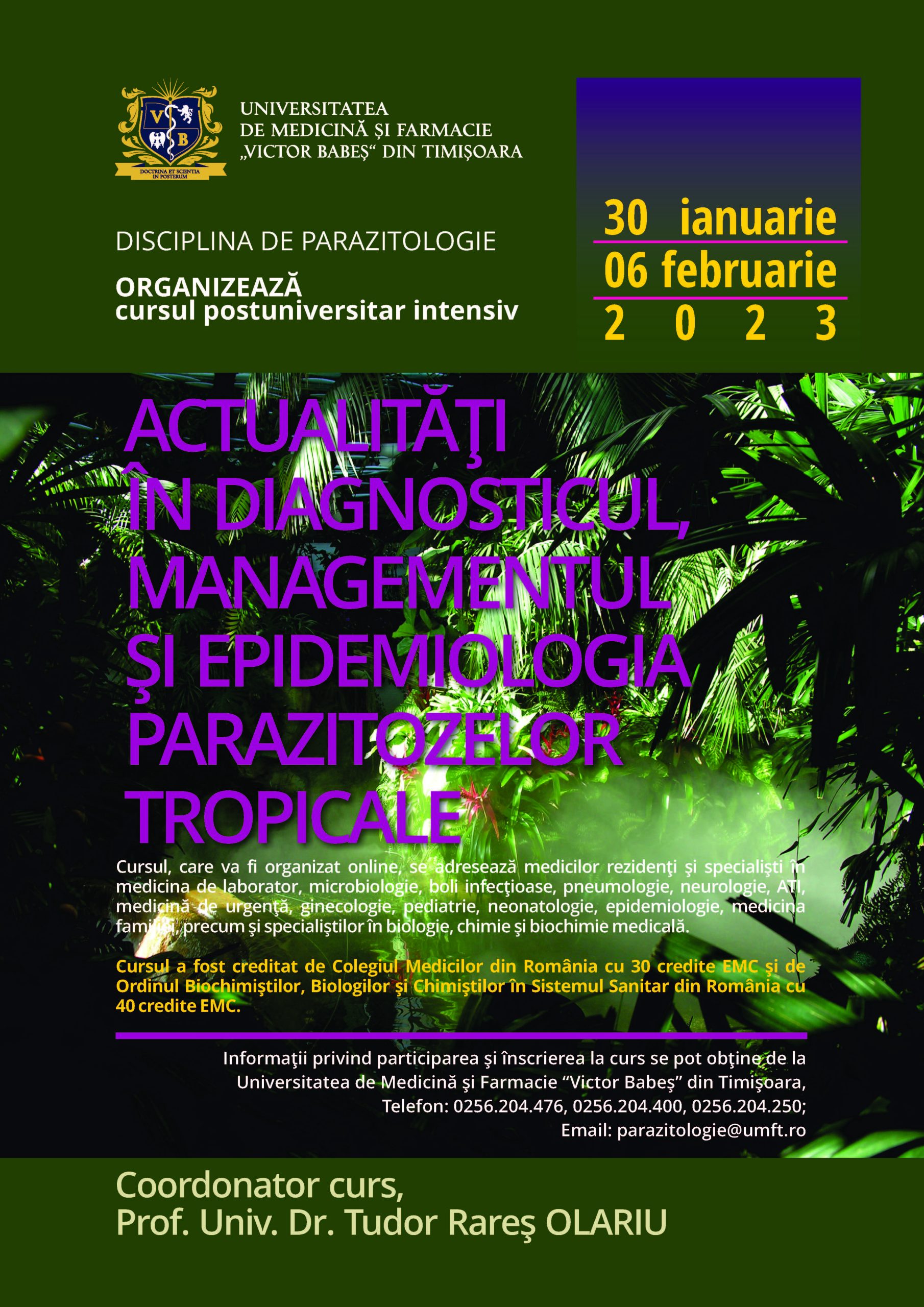 Informații privind participarea și înscrierea la curs se pot obține de la Universitatea de Medicină și Farmacie “Victor Babeș” din Timișoara, Telefon: 0256.204.476, 0256.204.400, 0256.204.250; Email: parazitologie@umft.ro