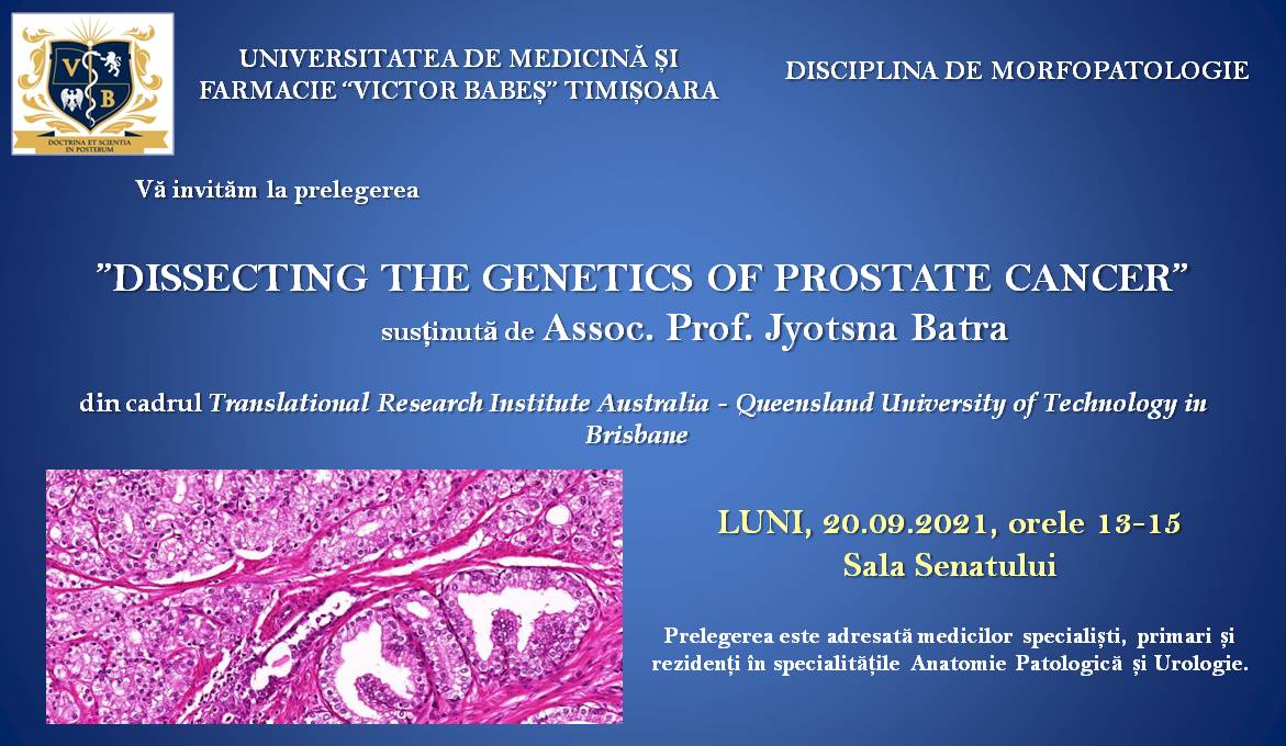 Vă invităm în Sala Senatului, în data de 20.09.2021, în intervalul orar 13-15, la susținerea unei prelegeri intitulată Dissecting the Genetics of Prostate Cancer, susținută de Assoc. Prof. Jyotsna Batra, din cadrul Translational Research Institute Australia – Queensland University of Technology in Brisbane.