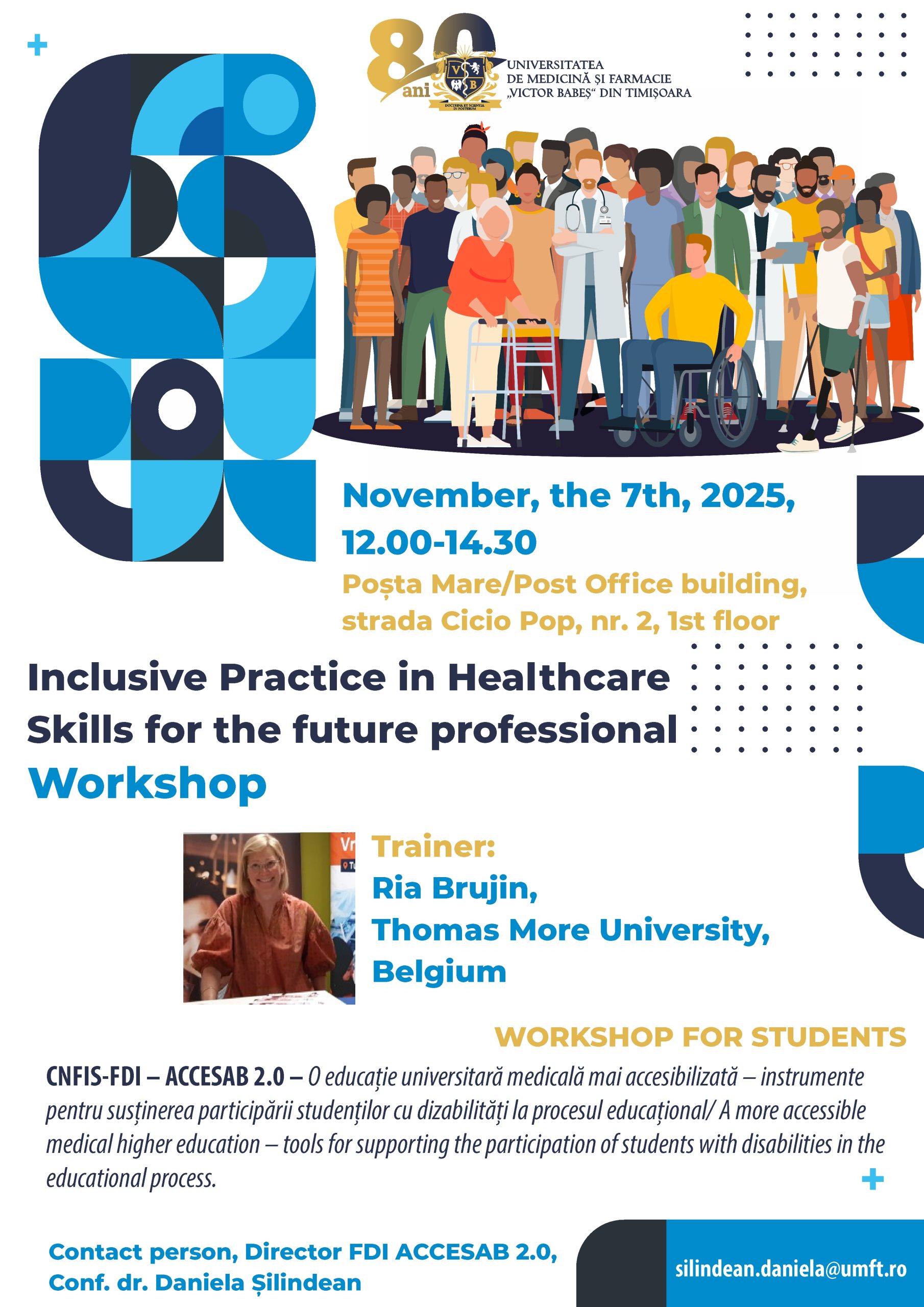 Victor Babeș University of Medicine and Pharmacy, Timișoara cordially invites you to the workshop Inclusive Practice in Healthcare. Skills for the Future Professional. The workshop will be facilitated by Ria Bruijn, Lecturer & Departmental International Coordinator, Thomas More University of Applied Sciences, Belgium.