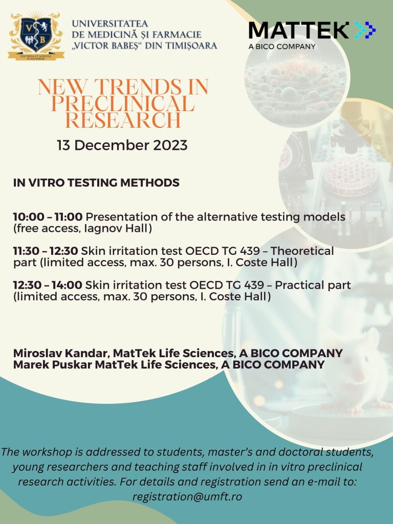 Between December 13-15, 2023, the first edition of the „New trends in preclinical research” workshop with international participation, organized by the Council for Doctoral University Studies, will take place at the „Victor Babes” University of Medicine and Pharmacy in Timisoara. The event will bring together lecturers and specialists from the area of research-development-innovation in the field of health and will have two main parts focused on in vitro and in vivo preclinical testing. Furthermore, a series of presentations and discussions sessions related to new type compounds with biological activity (synthesis, characterization, evaluation) are provided.