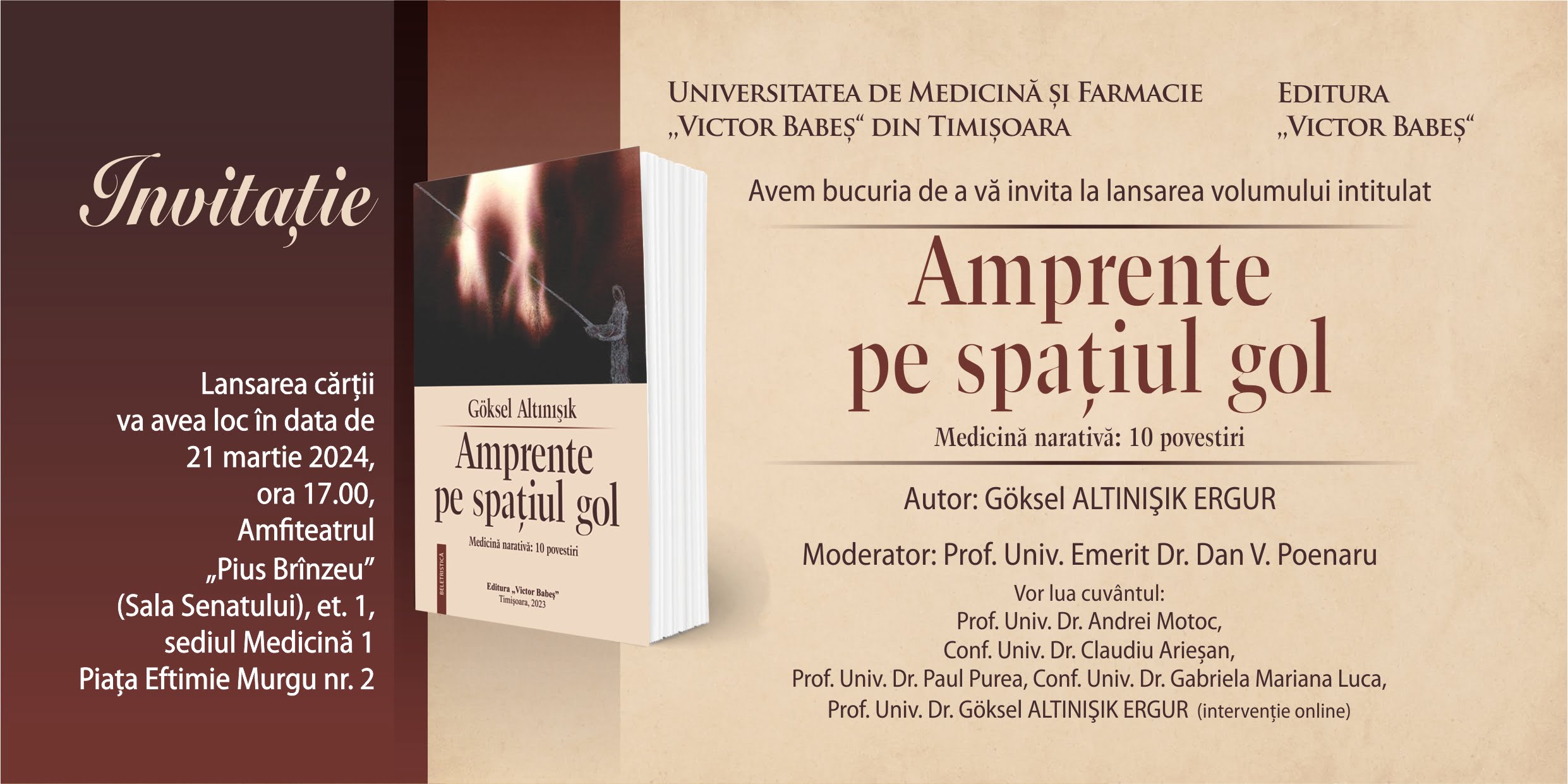 Evenimentul va avea loc în data de 21 martie 2024, ora 17.00, în Amfiteatrul „Pius Brînzeu” (Sala Senatului), et. 1, la sediul Medicină 1 din Piaţa Eftimie Murgu nr. 2.