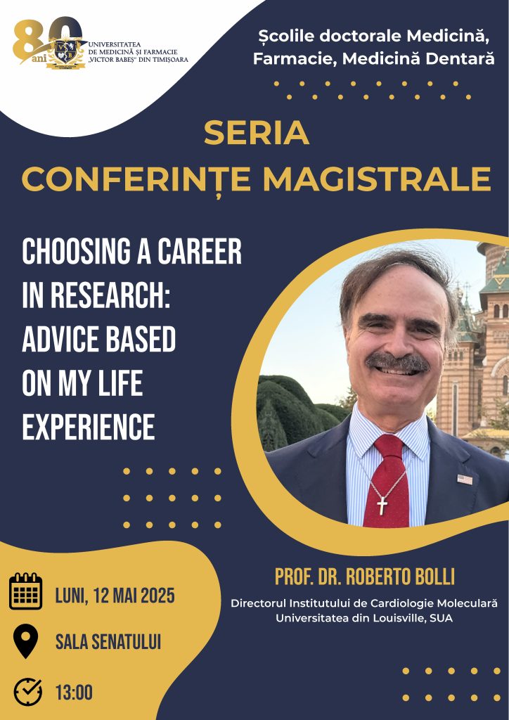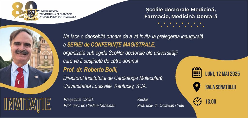 Ne face o deosebită plăcere să vă invităm la prelegerea inaugurală a SERIEI de CONFERINȚE MAGISTRALE, organizată sub egida Școlilor doctorale ale universității și care va fi susținută de către domnul Prof. dr. Roberto Bolli, Directorul Institutului de Cardiologie Moleculară, Universitatea Louisville, Kentucky, SUA.