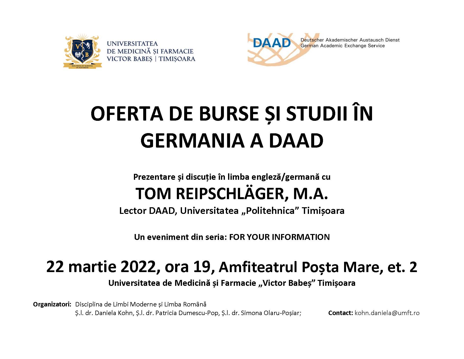 Evenimentul va avea loc în data de 22 martie, ora 19, Amfiteatrul Poșta Mare și se adresează studenților de la Medicină, Medicină Dentară și Farmacie, cunoscători ai limbii germane nivel mediu și avansat.