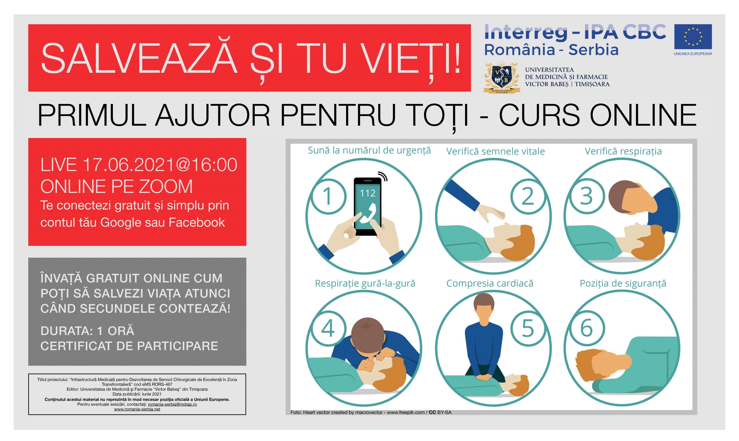 Universitatea de Medicină și Farmacie „Victor Babeș” din Timișoara te invită să iei parte gratuit la acest webinar ce te va învăța cum poți și tu acorda primul ajutor, explicat în 6 pași simpli. Nu este nevoie să ai cunoștințe de medicină, pentru că pașii necesari pot fi învățați de oricine.