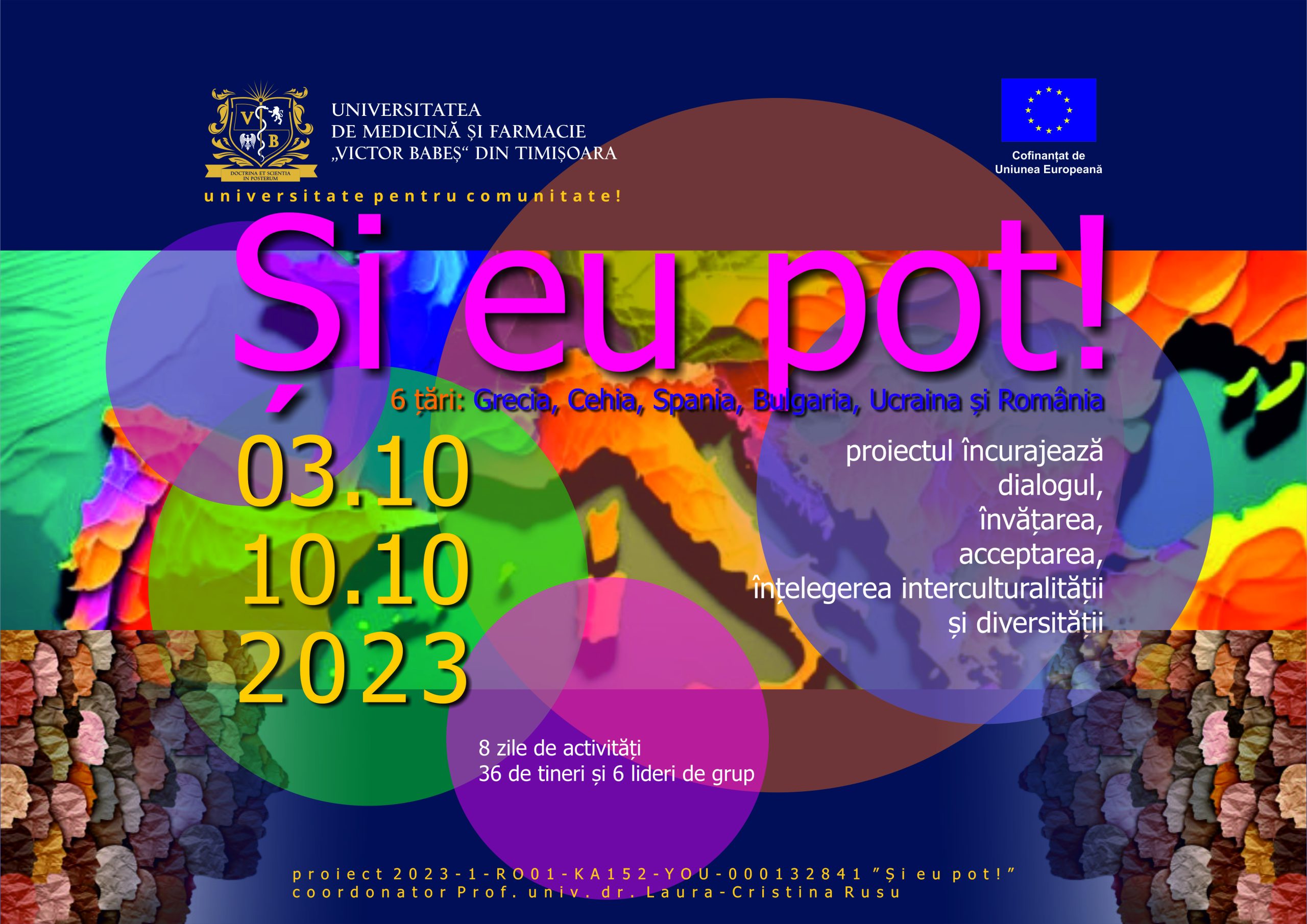 Universitatea de Medicină și Farmacie “Victor Babeș” din Timișoara implementează în perioada 03.10.2023-10.10.2023 proiectul dedicat tinerilor “Și eu pot” (2023-1-RO01-KA152-YOU-000132841).