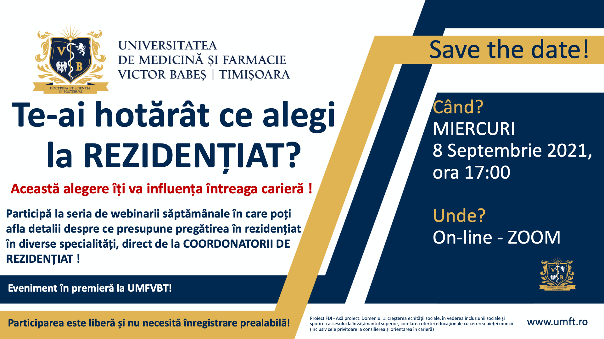 Tocmai de aceea, Universitatea de Medicină și Farmacie „Victor Babeș” își propune să vină în sprijinul proaspeților și viitorilor săi absolvenți prin organizarea unei serii de evenimente ce au ca scop prezentarea programelor de pregătire în rezidențiat ce pot fi alese în urma concursului.