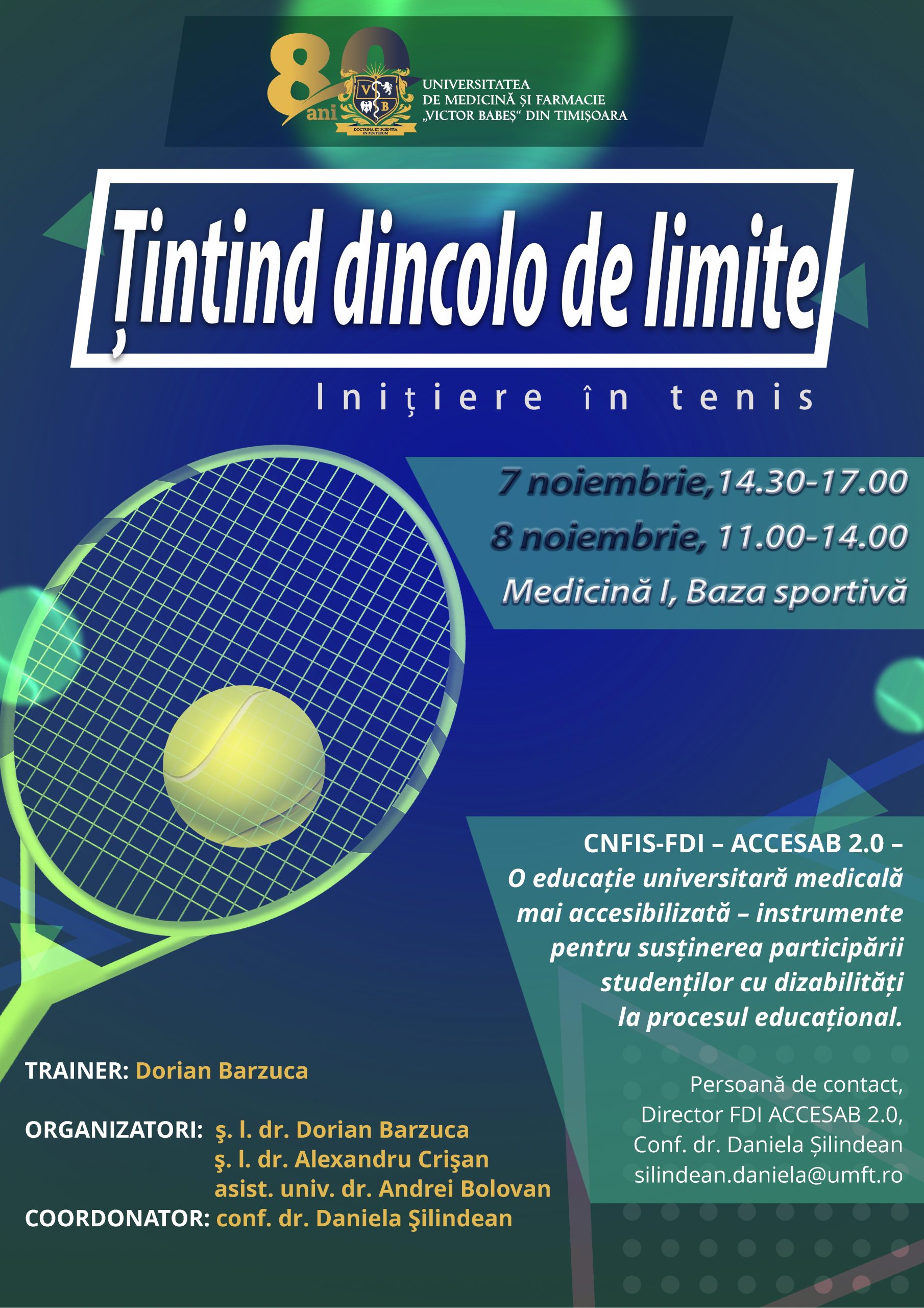 Universitatea de Medicină și Farmacie „Victor Babeș” Timișoara vă invită la Țintind dincolo de limite. Inițiere în tenis.