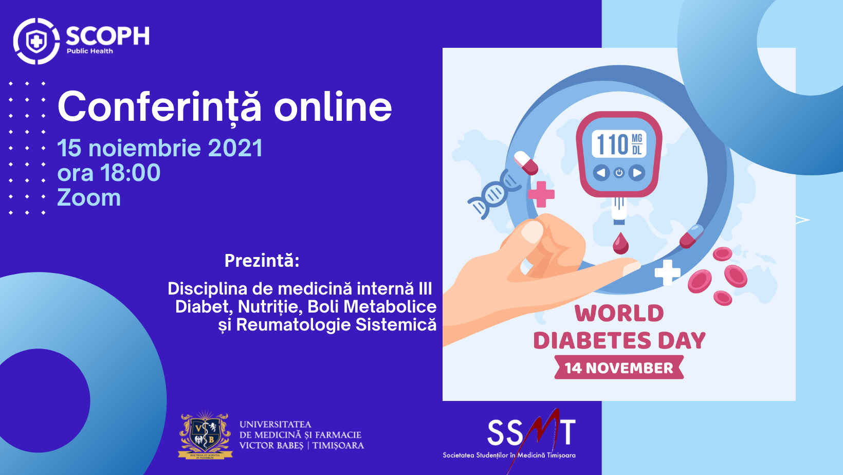 Cu ocazia Zilei Mondiale a Diabetului, Disciplina de Medicină Internă III – Diabet, Nutriție, Boli Metabolice și Reumatologie Sistemică, împreună cu departamentul SCOPH al Societății Studenților în Medicină din Timișoara, organizează un eveniment științific care va avea loc luni, 15 noiembrie, între orele 18-20, online, prin intermediul platformei Zoom.