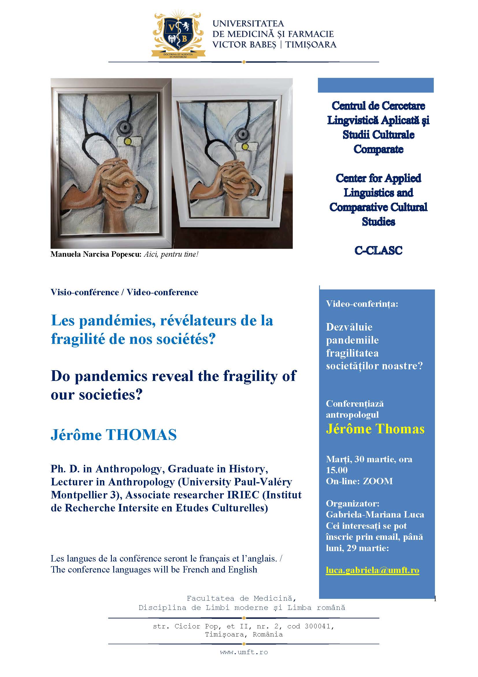 Video-conferințăMarți, 30 martie 2021, ora 15.00 On-line: ZOOM Organizator: Gabriela-Mariana Luca Cei interesați se pot înscrie prin email, până luni, 29 martie: luca.gabriela@umft.ro Les langues de la conférence seront […]