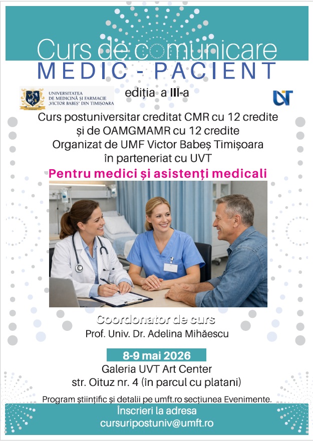 Clinica Universitară Medicina Familiei, sub auspiciile Universității de Medicină și Farmacie „Victor Babeș” din Timișoara, în parteneriat cu Clinica I Pediatrie, Fundația Universității de Medicină și Farmacie „Victor Babeș” Timișoara, Consiliul pentru Studii Universitare de Doctorat și Societatea Academică de Medicină a Familiei, organizează Conferința Națională cu Participare Internațională „Interdisciplinaritatea în Medicina de Familie” în perioada 11–13 iunie 2026, în Sala Aula Magna a UMF „Victor Babeș” Timișoara.