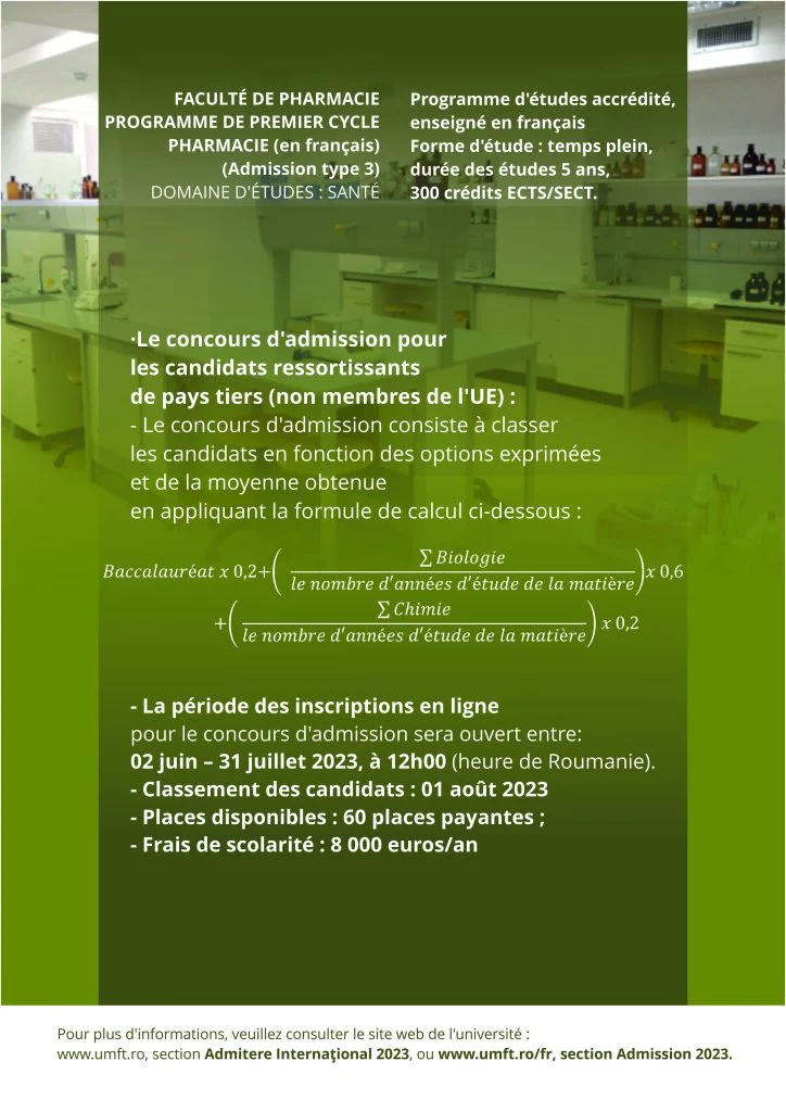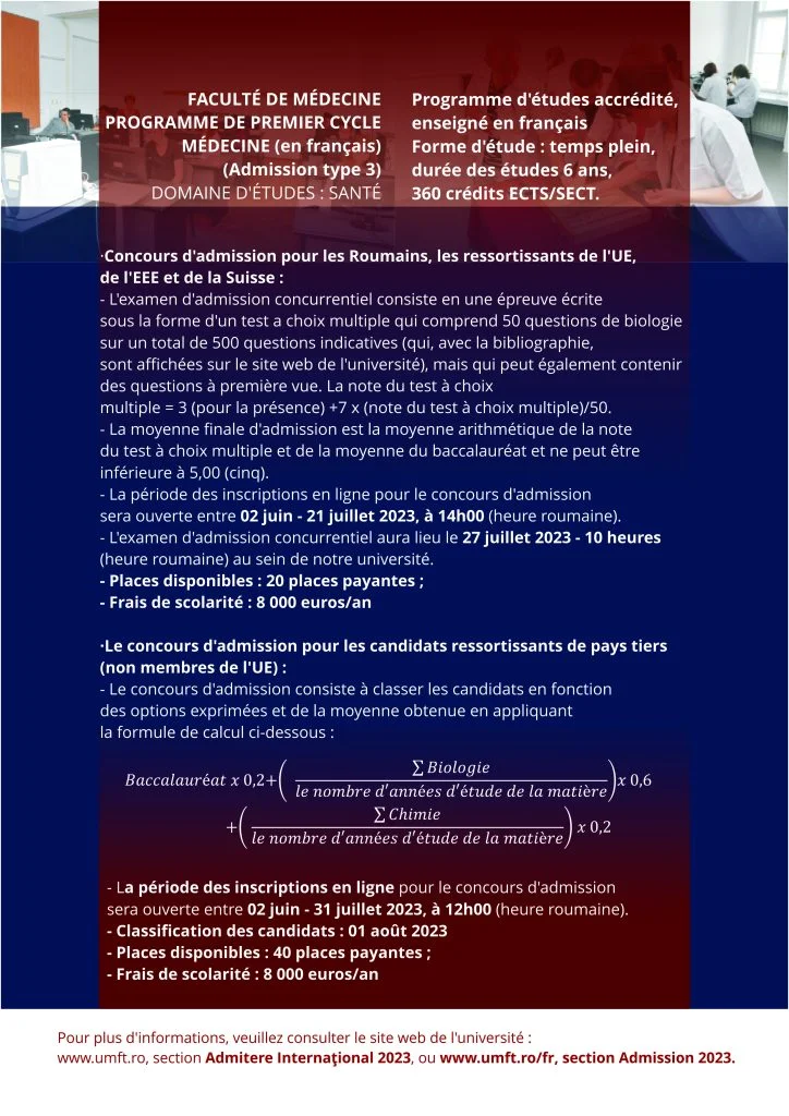 ⇒ LA LISTE DES CANDIDATS ROUMAINS (RO), DES RESSORTISSANTS DE L’UNION EUROPÉENNE (UE), DE L’ESPACE ÉCONOMIQUE EUROPÉENNE (EEE) ET DE LA CONFÉDÉRATION SUISSE (CH) DONT LA CANDIDATURE A ÉTÉ VALIDÉE ET QUI PEUVENT PARTICIPER À L’EXAMEN D’ADMISSION CONCURRENTIEL – Medicine en langue français – cliquez ici