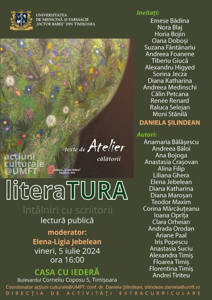 Universitatea de Medicină și Farmacie „Victor Babeș” din Timișoara vă invită, în cadrul programului acțiuni culturale@UMFT, la lectură publică din Texte de atelier (primul volum al Atelierului de scriere creativă din cadrul UMFT).