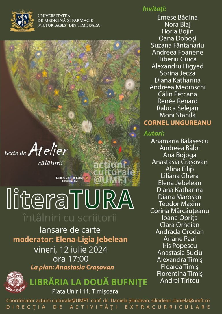 Universitatea de Medicină și Farmacie „Victor Babeș” din Timișoara vă invită, în cadrul programului acțiuni culturale@UMFT, la lansarea volumului texte de Atelier. călătorii, coordonat de Elena Jebelean.