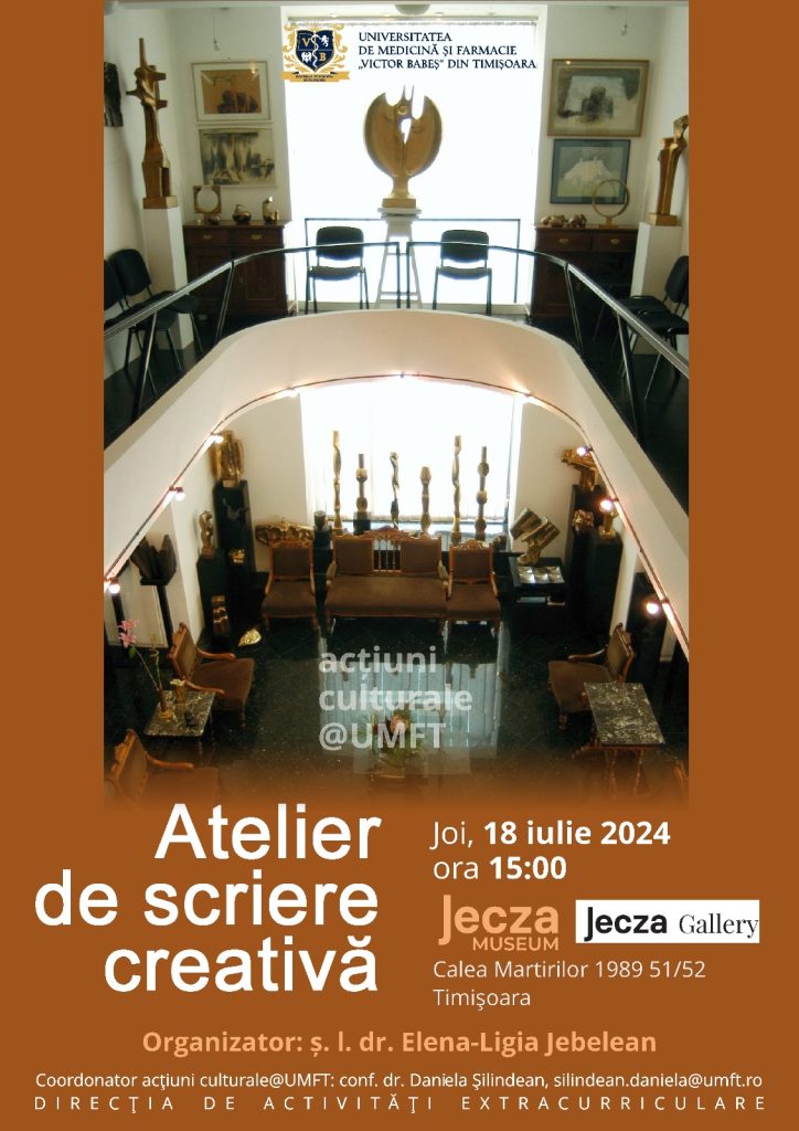Universitatea de Medicină și Farmacie „Victor Babeș” din Timișoara vă invită, în cadrul programului acțiuni culturale@UMFT, la Atelierul de scriere creativă, coordonat de Elena Jebelean.