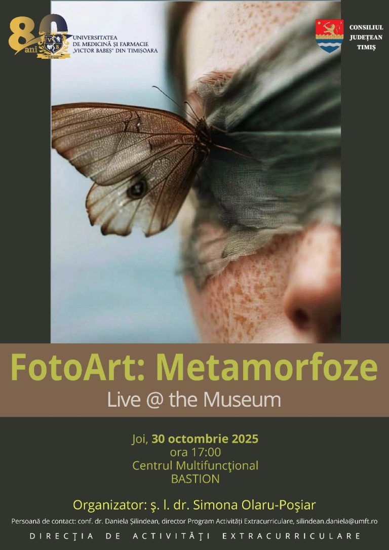 Universitatea de Medicină și Farmacie „Victor Babeș” din Timișoara vă invită, în cadrul programului acțiuni culturale@UMFT, la Live@theMuseum – FotoArt: Metamorfoze.