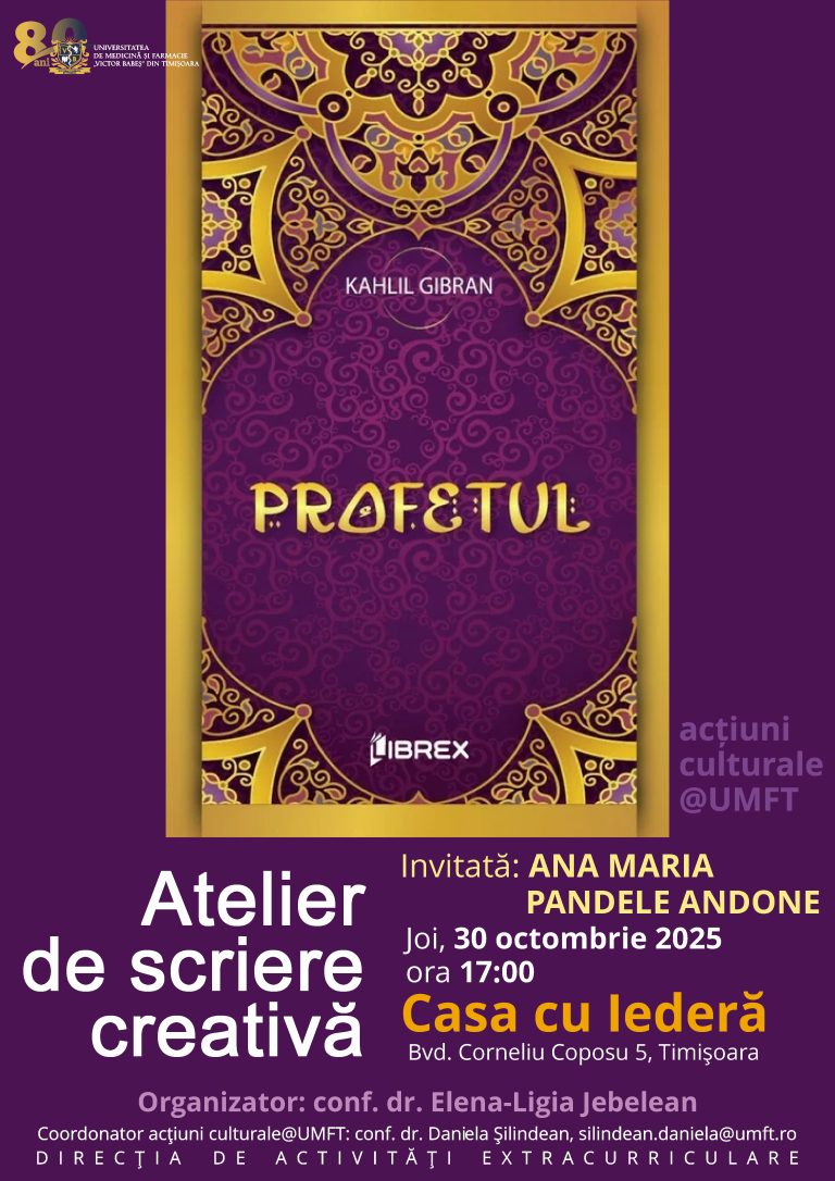 Universitatea de Medicină și Farmacie „Victor Babeș” din Timișoara vă invită, în cadrul programului acțiuni culturale@UMFT, la Atelierul de scriere creativă.