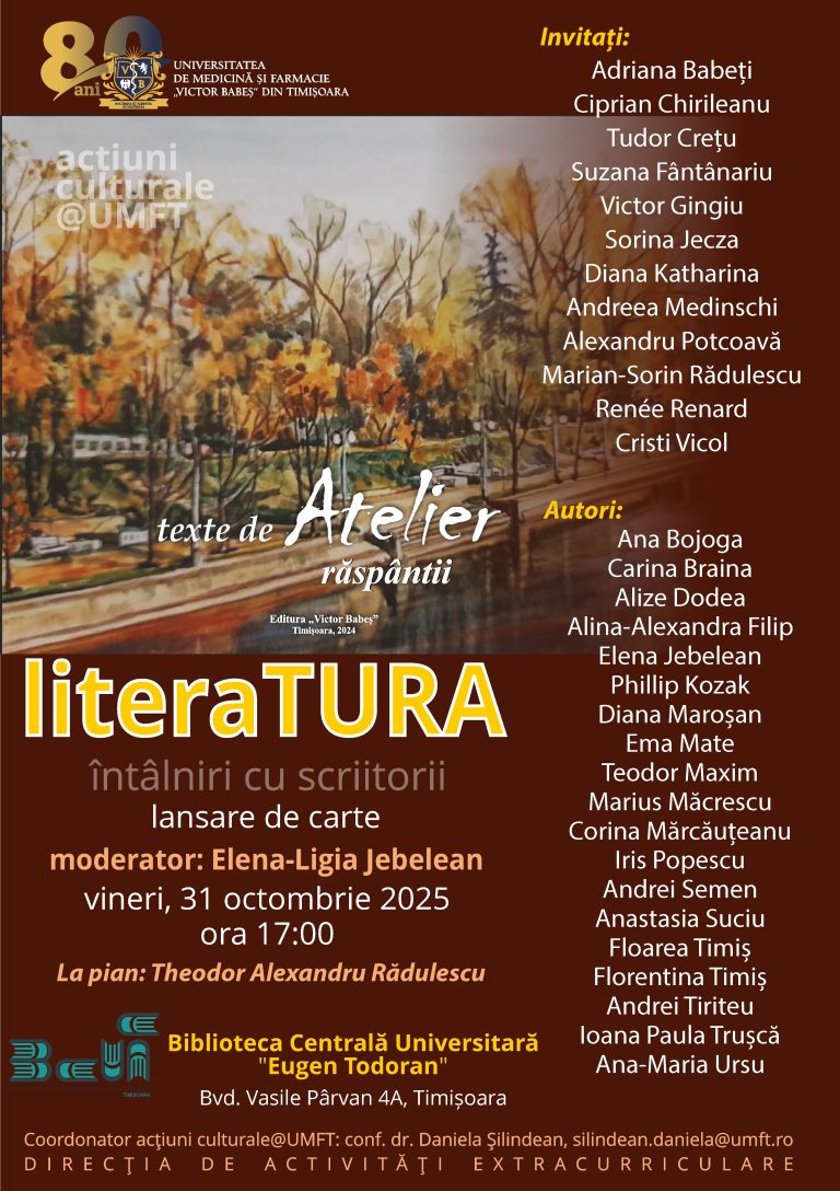 Universitatea de Medicină și Farmacie „Victor Babeș” din Timișoara vă invită, în cadrul programului acțiuni culturale@UMFT, la întâlnirea cu autorii care publică în volumul colectiv texte de Atelier. răspântii și cu invitații lor.