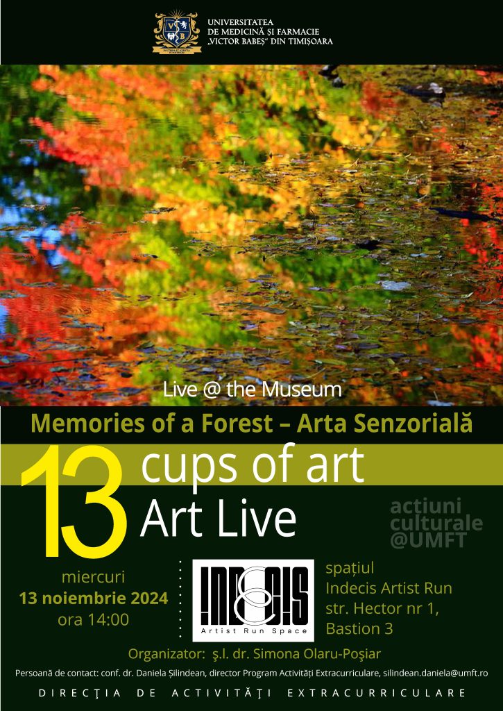 Universitatea de Medicină și Farmacie „Victor Babeș” din Timișoara vă invită, în cadrul programului acțiuni culturale@UMFT, la 13 Cups of Art Live@ the Museum, Memories of a Forest – Artă Senzorială.