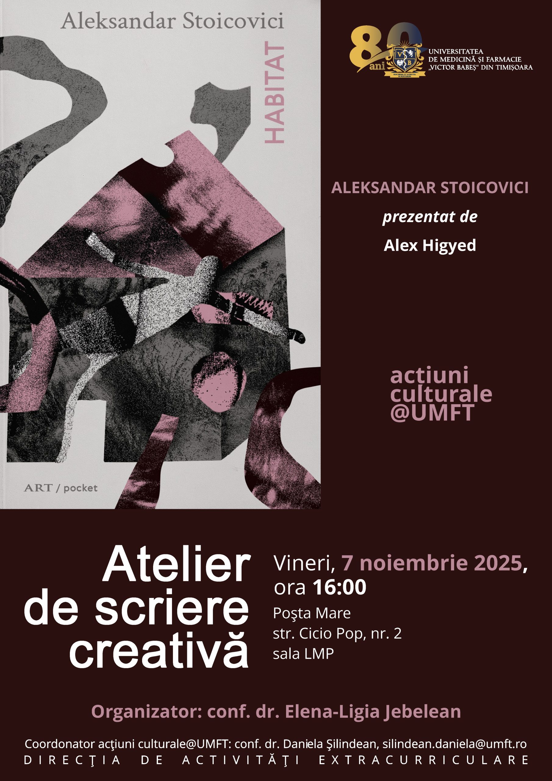 Universitatea de Medicină și Farmacie „Victor Babeș” din Timișoara vă invită, în cadrul programului acțiuni culturale@UMFT, la Atelierul de scriere creativă.
