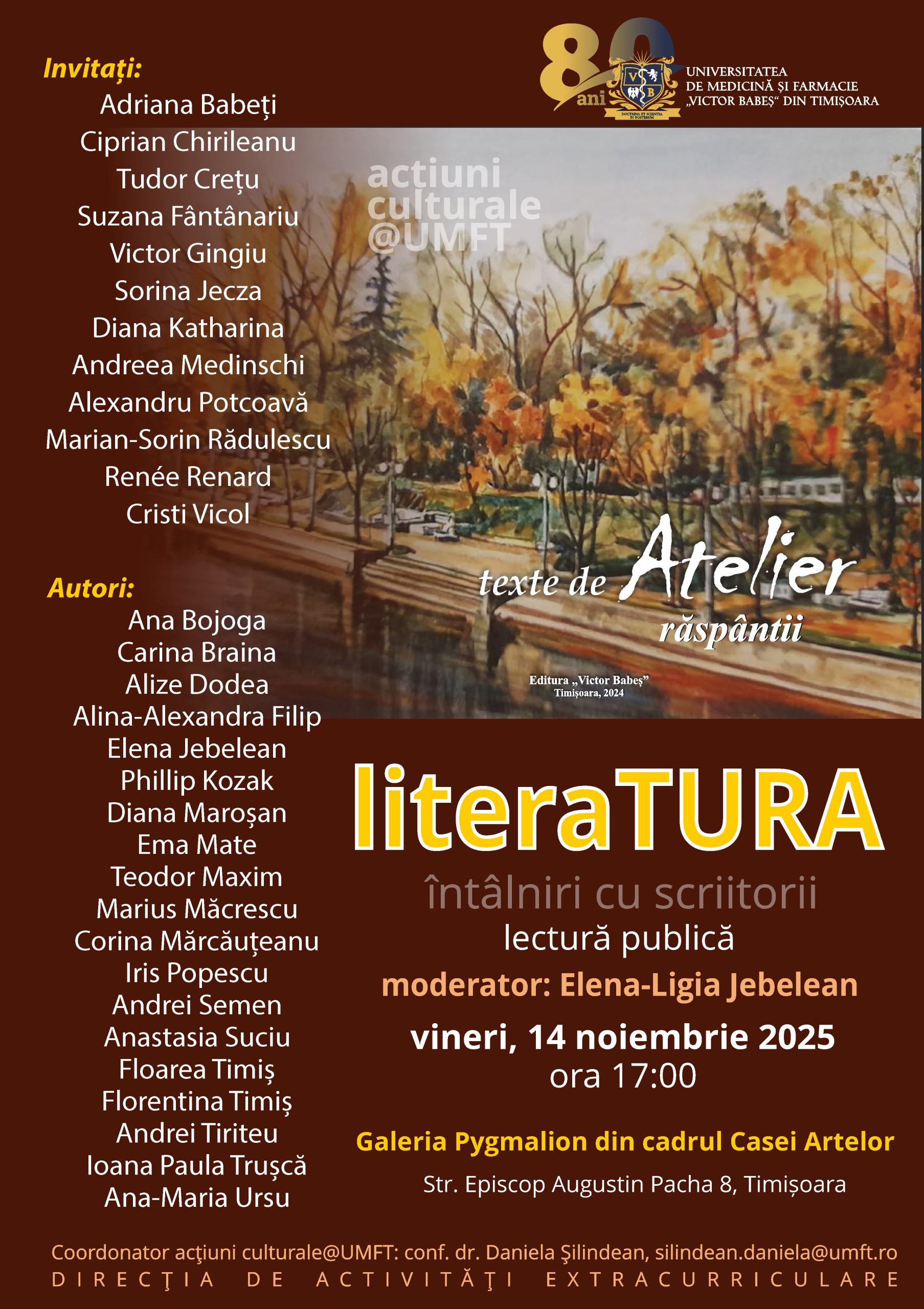 Universitatea de Medicină și Farmacie „Victor Babeș” din Timișoara vă invită, în cadrul programului acțiuni culturale@UMFT, la lectura publică a textelor publicate în volumul colectiv texte de Atelier. răspântii.