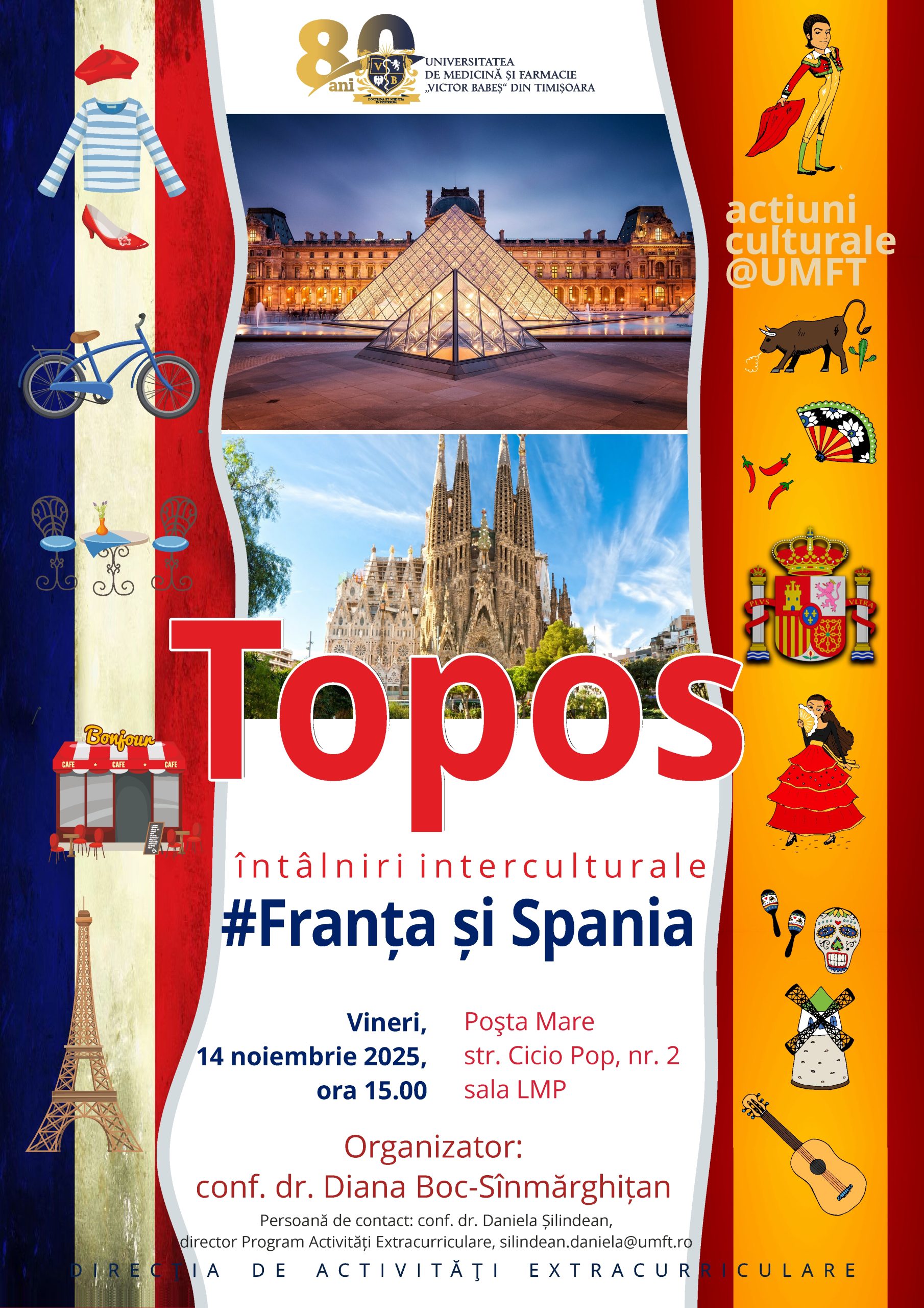 Întâlnirile noastre interculturale vor avea, de această dată, ca punct central de cunoaștere două țări fascinante, Spania și Franța, fiecare purtătoare a unei identități culturale vibrante și a unei istorii bogate. Vom pătrunde în lumea culorilor, aromelor și emoțiilor iberice, dar și în rafinamentul și eleganța spiritului francez. Prin dialogul cu nativi – viitori medici și farmaciști – vom descoperi perspective autentice asupra valorilor, tradițiilor și modului de viață din aceste spații culturale. Vom explora diversitatea lingvistică, expresiile cotidiene, obiceiurile culinare și felul în care arta, literatura și istoria au modelat mentalitățile de astăzi. Această experiență comună ne va ajuta să înțelegem mai bine nu doar diferențele, ci și punțile subtile care unesc oameni și culturi, invitându-ne să privim lumea (și pe noi înșine) prin ochii celuilalt.