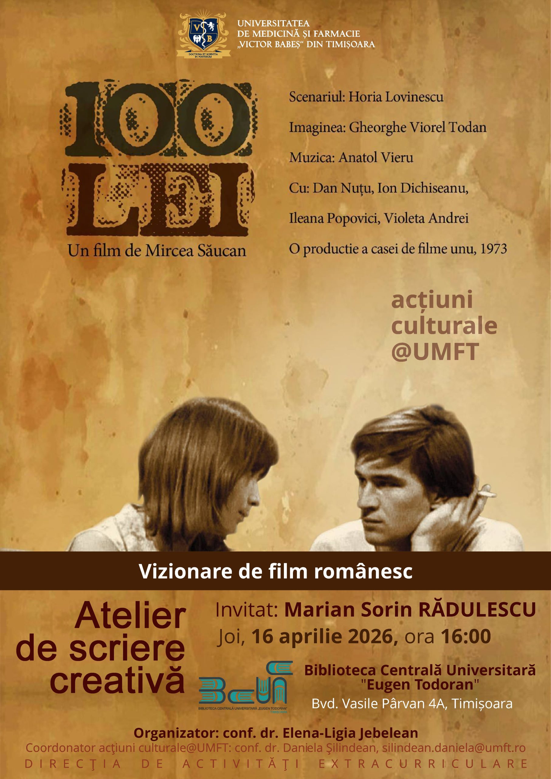 Universitatea de Medicină și Farmacie „Victor Babeș” din Timișoara vă invită, în cadrul programului acțiuni culturale@UMFT, la Atelierul de scriere creativă – discuții și vizionare de film: 100 de lei (1973), în regia lui Mircea Săucan.