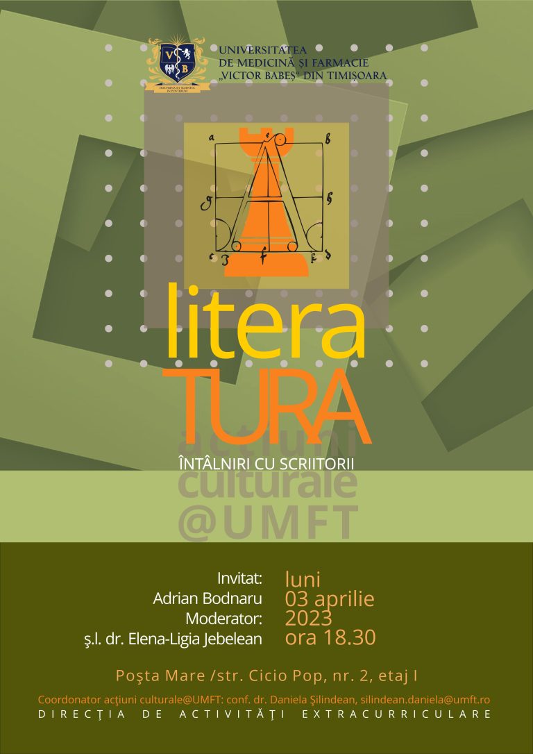 Universitatea de Medicină și Farmacie „Victor Babeș” din Timișoara vă invită la o nouă întâlnire LiteraTURA, din cadrul programului acțiuni culturale@UMFT.