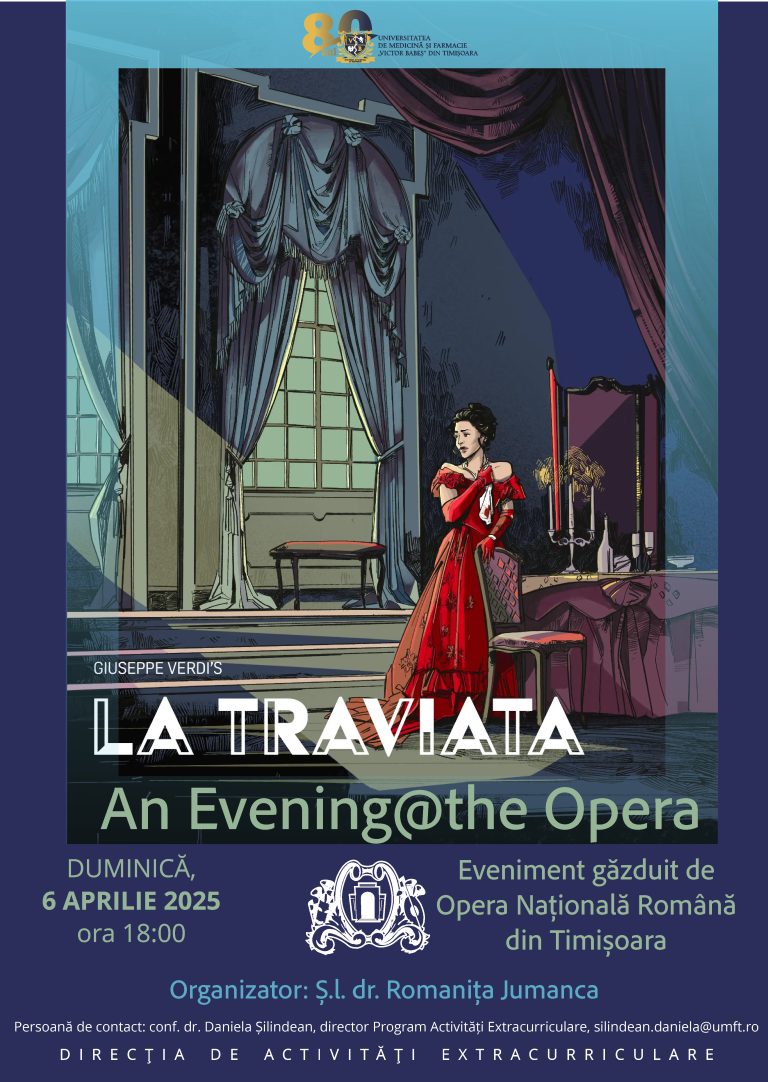 Universitatea de Medicină și Farmacie „Victor Babeș” din Timișoara organizează o nouă întâlnire în cadrul programului acțiuni culturale@UMFT: An Evening at the Opera, în parteneriat cu Opera Națională Română din Timișoara.
