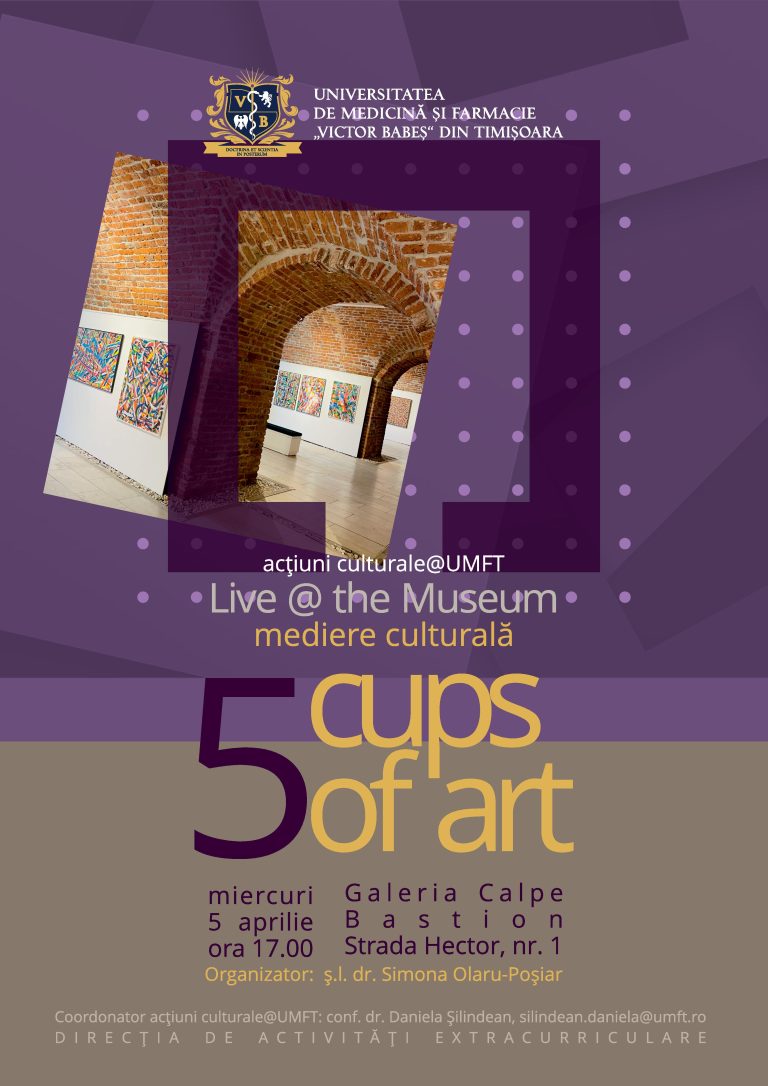Live@ the Museum continuă dialogurile aflate sub semnul medierii culturale. Cu 5 Cups of Art revenim în spațiul primitor al Galeriei Calpe. Ne propunem un dialog interdisciplinar între artă și medicină. Vom explora percepții și reprezentări inedite prin apelul la sculptură, pictură și grafică.
