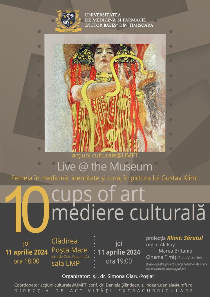 Universitatea de Medicină și Farmacie „Victor Babeș” din Timișoara organizează cea de-a zecea ediție a întâlnirilor Live @ the Museum – 10 Cups of ART și celebrează femeia în medicină, plecând de la tema Identitate și curaj în pictura lui Gustav Klimt.
