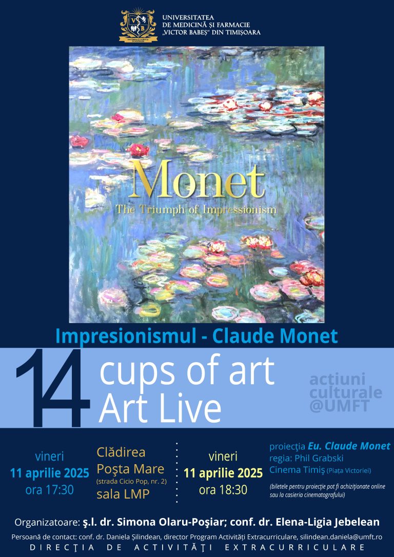 Evenimentul 14 Cups of Art – Impresionismul, Claude Monet, are loc vineri, 11 aprilie 2025, de la ora 17.30, în clădirea Poșta Mare (strada Cicio Pop, nr. 2), etaj I și continuă la ora 18.30 cu vizionarea peliculei Eu, Claude Monet, în regia lui Phil Grabsky la Cinema Timiș (Piața Victoriei, nr. 7) și este organizată de ș. l. dr. Simona Olaru-Poșiar și conf. dr. Elena-Ligia Jebelean.