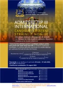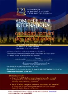 Consiliul de Administrație ( (Nr. 37/34570/19.12.2023) al Universității de Medicină și Farmacie ”Victor Babeș” din Timișoara a hotărât prelungirea termenului de înscriere în anul I până în data de 25 februarie 2024, pentru cetățenii din țări terțe care au primit Scrisoarea de Acceptare la studii și au achitat taxa de școlarizare.