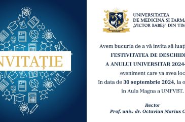 Deva Timișoara Universitatea de Medicină şi Farmacie „Victor Babeş” din Timişoara are bucuria de a vă invita să luați parte la FESTIVITATEA DE DESCHIDERE A ANULUI UNIVERSITAR 2024-2025, care va avea […]